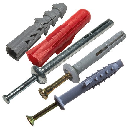 Полипропиленовый распорный дюбель укомплектован гвоздь-шурупом из стали с оцинкованным покрытием с желтым пассированием.